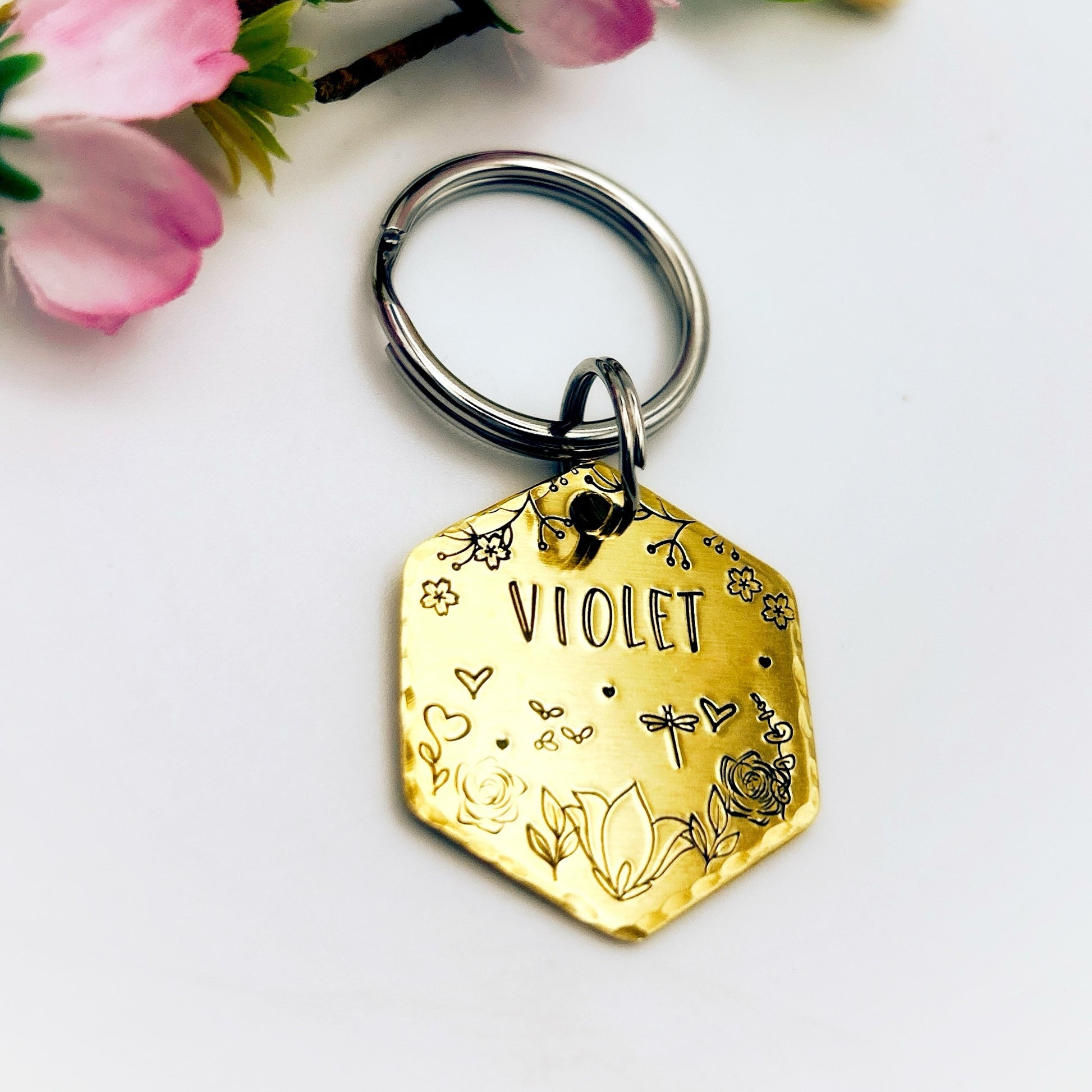 Médaille Personnalisée pour Chien, Médaille d'Identité Chien Personnalisable, Médaillon Argent Hexagone, Fleurs et Nature